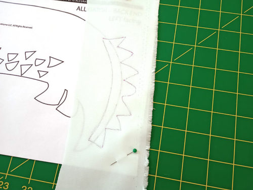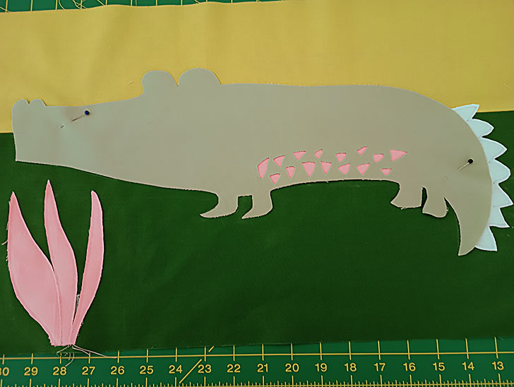 - Peel away the paper backing on the Alligator body. Following your drawn outline on the front sewn panel, place the body into position. Place it down lightly to start so you can adjust it as needed. The color the the Belly scales should peek through all the windows and the Alligator body should overlap the Tail Ridge. This is why you stitched the Tail Ridge separately. You have a beautiful curved finish over the “spikes.” Pin in place