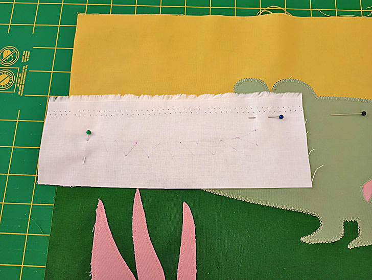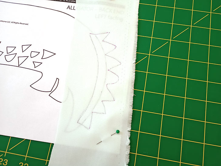- With the perimeter stitched, find the fabric piece with the Alligator teeth, which should have the fusible web applied to the back. Peel away the paper backing, and using the corner guide you originally sketched in place next to the Cheek circle, place the teeth into position on the Alligator body. You can certainly use the original paper template to draw in additional guidelines if you’d like. Pin in place. Do not fuse with heat.