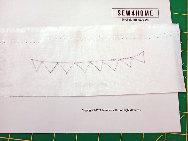 - We used a tiny straight stitch with a center needle position and a 1.8 stitch length.
