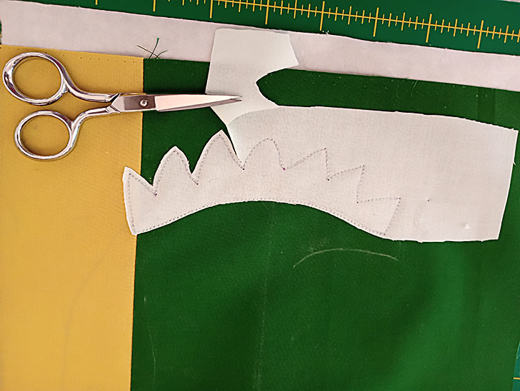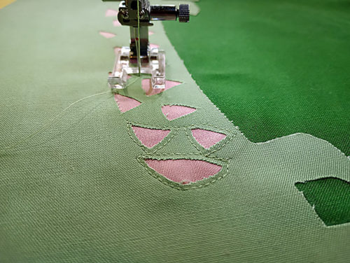 - When complete, using your tiny, sharp scissors, trim close to the stitching. You can trim away the excess because you have not yet activated the fusible web with heat; you’ve only finger pressed and pinned it in place. Aren’t you smart?!