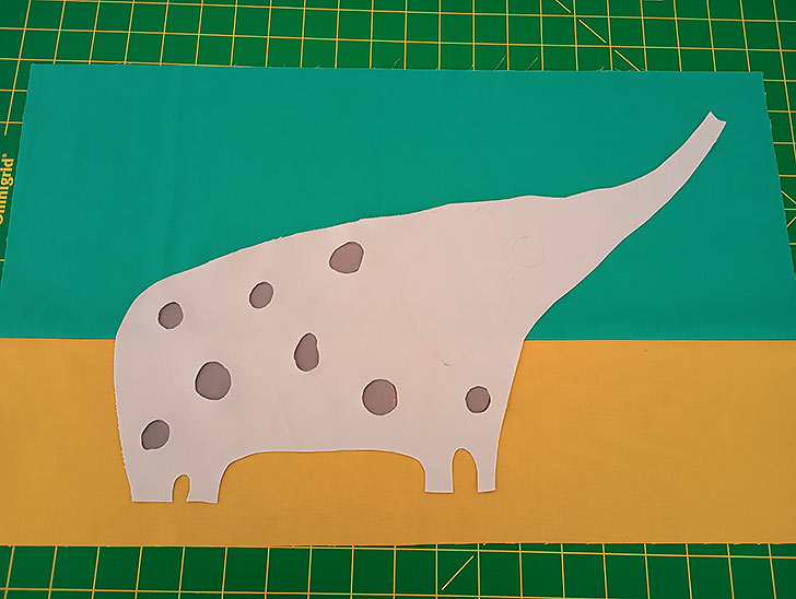 - The Elephant’s Spots are done with the reverse appliqué technique, but rather than a piece of the darker color cut to cover the entire body area, individual circles (just a bit larger than the window) were cut and adhered behind each Spot window. The Spots are far enough apart that this works perfectly. It also helps keep the main layer flatter and smoother.