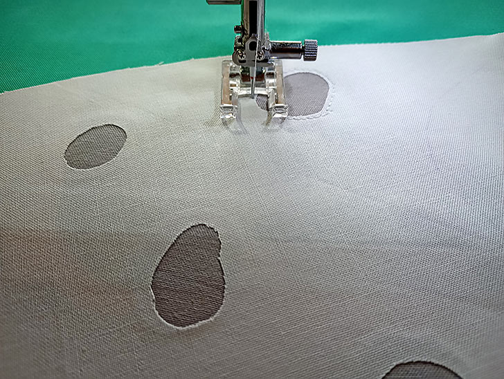 - With a straight stitch, go around each of the 15 Belly Scale windows. If a feature on your machine, use a lock stitch to end each window’s stitch line. This will give you the neatest finish. It is okay if your window stitch outlines slightly overlap one another.