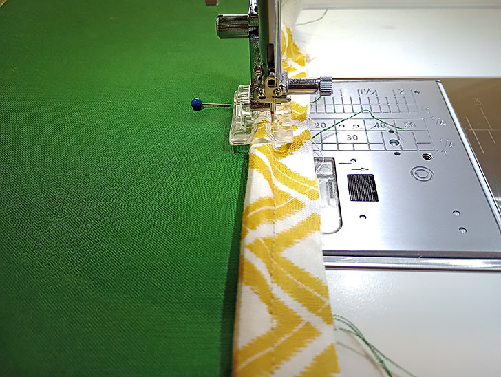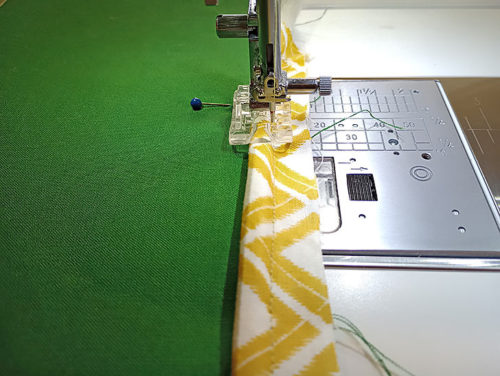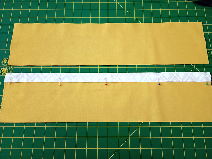 - Place the binding strip right sides together along the top 21” edge of the non-interfaced panel. Pin together.