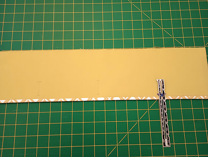 - Peel away the paper backing from the wedge shape cut to cover the area for the Belly Scales. Place it in position on the front panel. We used the front panel outline as a guide, but also double-checked the position by laying the Alligator body, with all its cut windows, into position as well.