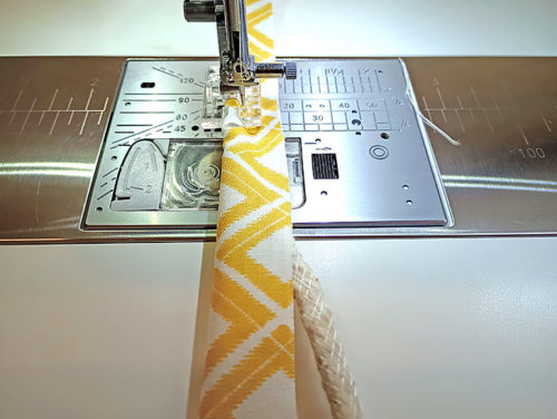 - Wrap the piping strip around the piping cord right side out. Make sure the raw edges of the strip are flush with the cord running down the middle.