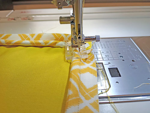- With the piping pinned in place all around, baste the piping in place all around. We continued to use a Wide Groove Beading foot; a Zipper foot with the needle moved to the left is another good option.