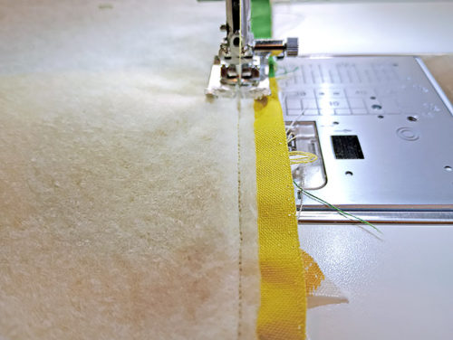 - Using a ¼” seam allowance, stitch the binding strip to the panel.