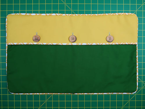 - Find the overlap panel. Mark for three evenly spaced buttonholes along the bound edge. We placed one at the exact center of the panel and one 5½” to either side of center. The bottom of our buttonholes are ¼” up from the binding strip.