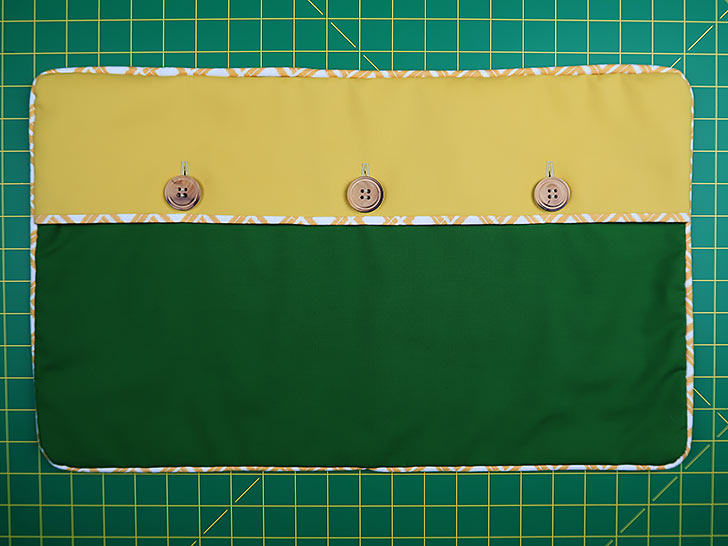 NOTE: If you are brand new to stitching buttonholes, we have an overview tutorial you can review prior to starting the project. - With the buttonholes sewn and carefully cut open, overlap the panels so the finished size of the overall panel is 21” wide x 13” high. Pin the sides at the overlap. You can leave it with just the pins, but we often recommend machine basting the overlapped panels in place so you can more work with the back as “one piece” for the final construction.
