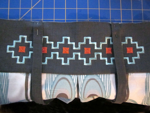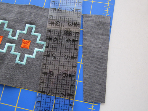 - Trim the finished panels to 18″ wide x 5″ high, positioning the embroidery so it is centered side to side and top to bottom.