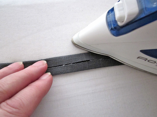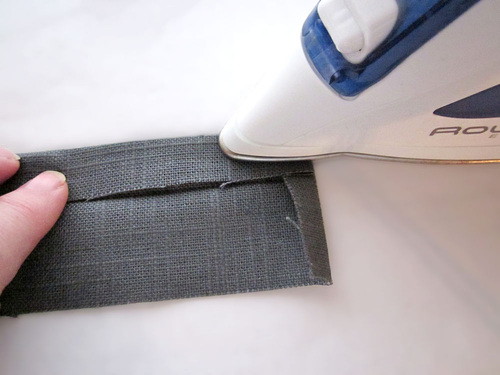 - On each strip, press in the 15″ sides ⅜”, which means the raw edges will just meet at the middle of the strip. The strips should now be ¾” wide. Both ends are raw. Set them aside.