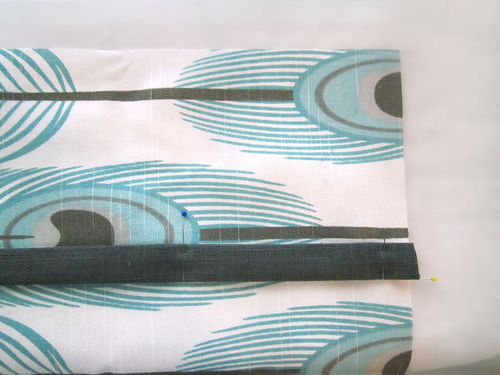 - On the remaining lining panel, first place the finished pocket along the top edge. Center pocket over the panel’s pleat, aligning the raw edges of the panel with the raw edges of the pocket. Pin or hand baste the pocket in place.