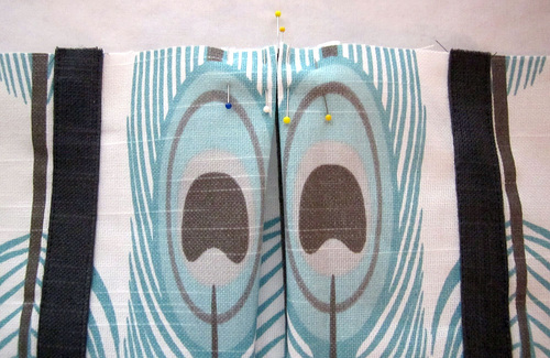 - Fold in the outer pins to meet in the middle at the center pin, creating a box pleat. This pleat takes up 4″, bringing down the top edge to 16″, which will now match perfectly with the bottom edge of the border accent panel. Make sure you pleat both the front and back panels.