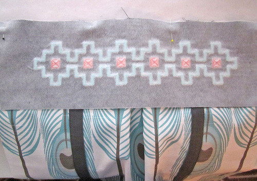 - Find the two embroidered border accent panels. Place one panel right sides together with each bag body panel, aligning the bottom 16″ edge of the accent panel with the top 16″ edge of the bag body. Pin in place.