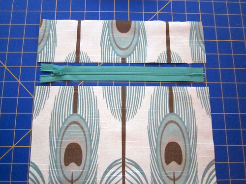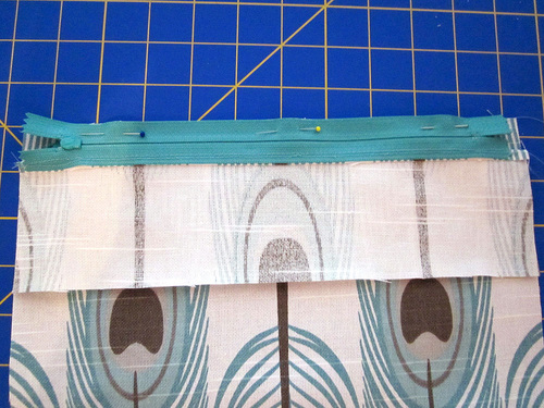 - Place the small top section right sides together with the top edge of the zipper tape. Pin in place.