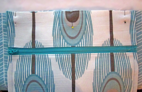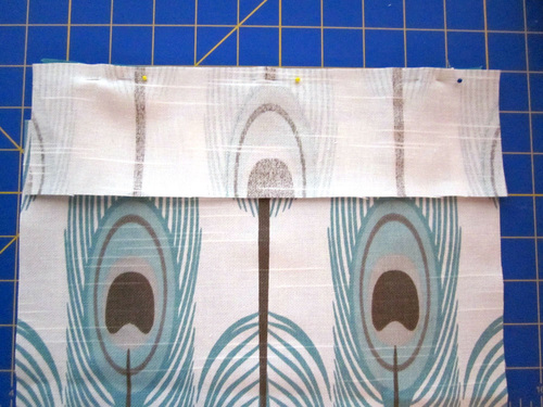 - Fold up the bottom edge of the pocket panel to align with the top edge, sandwiching the zipper between the layers. Pin along both sides.