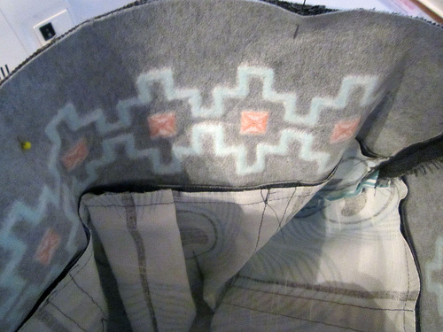 - Place the lining front and back right sides together, aligning all the raw edges. Be particularly careful to align the accent panel seams. Pin in place, leaving a 6″ opening along the bottom edge.