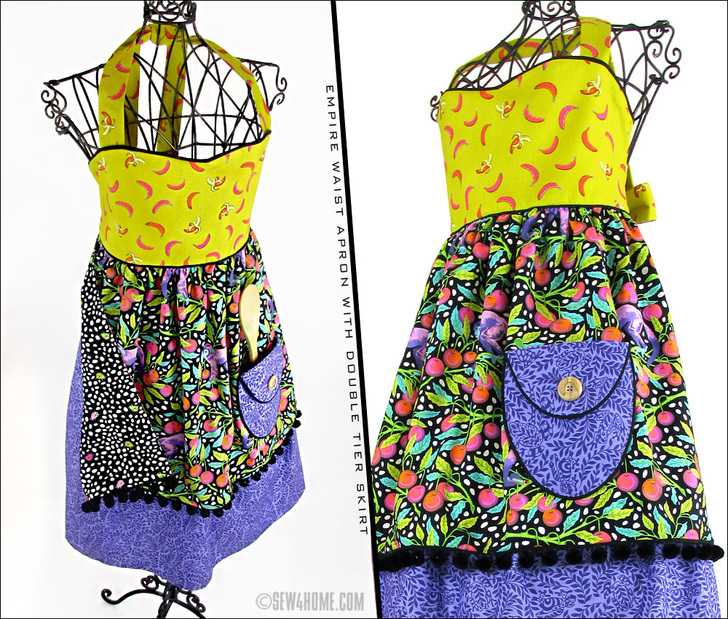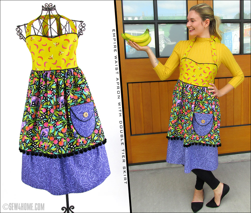 We’ve included detailed instructions and photos to take you every step of the way through the apron’s construction. And, as always, we include links to full step-by-step tutorials for any specialty techniques, such as gathering, piping, even the diagonal point corners that finish the main skirt.