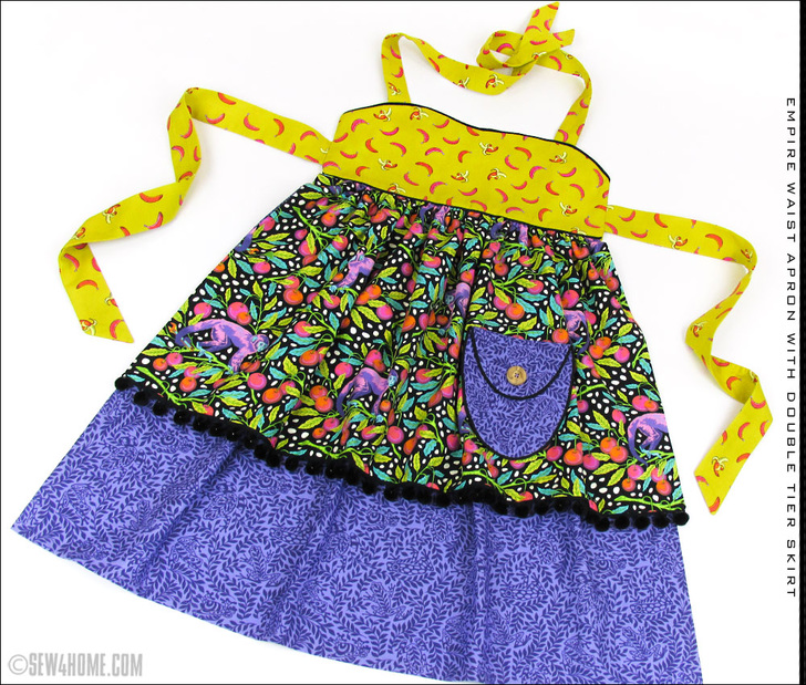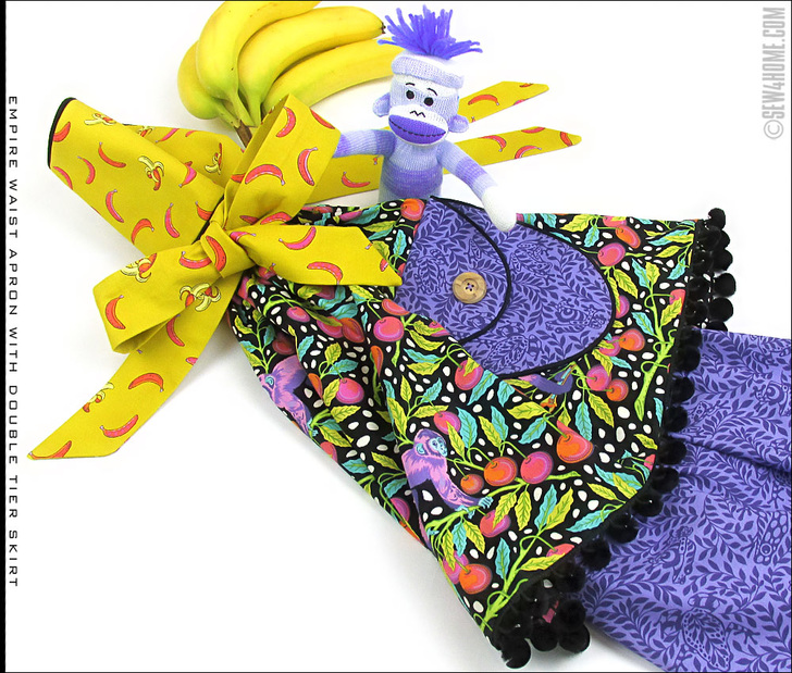 Clean and simple is usually Design Rule #1. But that doesn’t mean you can’t build something beautiful with the right combination of several special details. This adorable apron features: an empire waist, pretty piping accents, a double layer skirt, bouncy poms, and a unique oval pocket. Making it extraordinary is our use of the Monkey Wrench fabric collection by master designer, Tula Pink. It’s full of colorful motif mischief.
