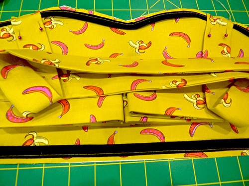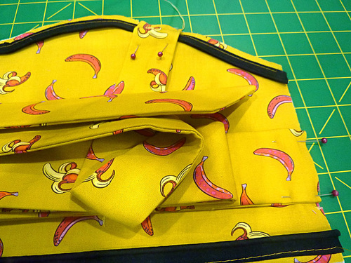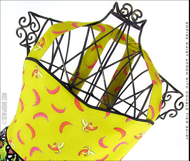 There’s a downloadable pattern for the pretty curved bodice as well as the fold-over oval pocket. The pocket’s flap is secured with a single large button. We used a simple wooden button that blended well with the bananas, but this accent could also be a great excuse to add a little surprise bling with a flashy rhinestone or sequin button.