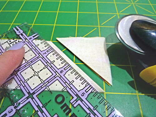 - With a see-through ruler and rotary cutter, trim one end of each folded tie at a 45˚ angle.