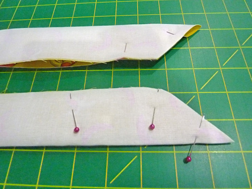 - Pin down the long side and across the angled end of each tie. The opposite end remains raw.