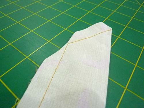 - Using a ½” seam allowance, stitch along the side and across the angled end, pivoting at the corner. Remember, that opposite end is left open for turning.