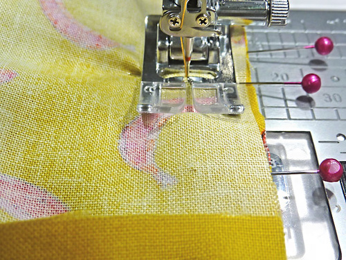 - Using a ½” seam allowance, stitch along both sides and across the bottom. Remember to pivot at the corners.