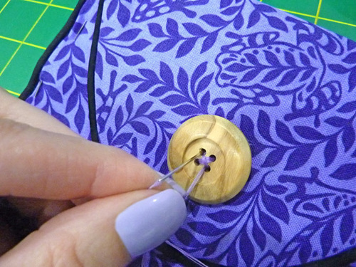 - Using the marked point, hand stitch the button in place through all the layers of the pocket. This stitched button is what holds the folded top of the pocket in place. We used a pretty X hand stitch in a contrasting color to the button.