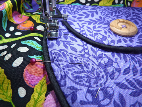 - Use a Zipper foot to stitch the pocket in place, running the seam right along the piping (stitching in the ditch of the piping). Remember to start and stop at the pocket’s folded top edge.