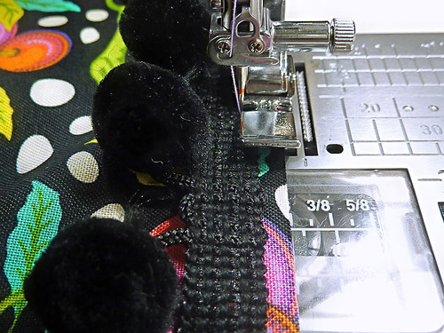 - Still using a Zipper foot, machine baste the pom trim in place.