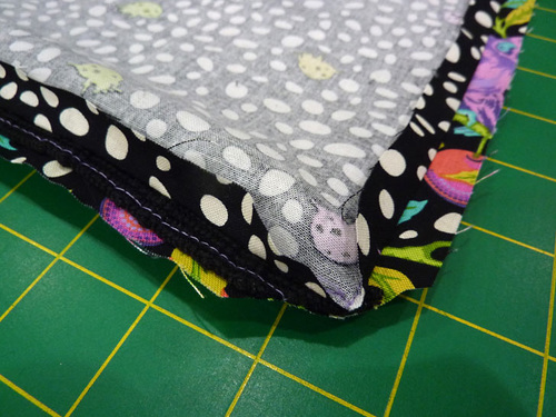- Along both sides and across the bottom create a narrow ½” double turn hem with diagonal point corners. To do this, fold in the side edges ½” and press.