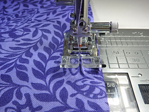- NOTE: We are using our built-in fabric feeding system, the Janome AcuFeed™ Flex system for this step because of all the layers. You could certainly use a standard presser foot or a Walking/Even Feed foot. With any option, go slowly to keep ny shifting to a minimum and make sure you are staying as close as possible to the piping.