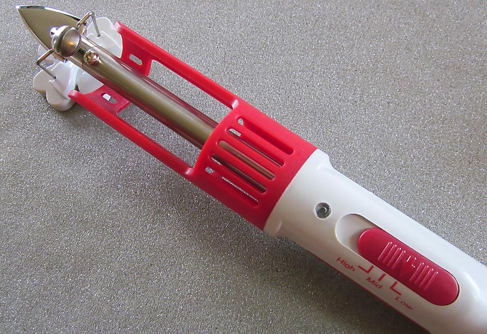The iron heats up quickly, and with three basic settings of high, medium and low; you can adjust the heat to match your fabric type. High is quite hot. We scorched one of our test samples by leaving the iron tip in one place too long on the high heat setting! There is an on/off switch on the cord and an indicator light on the base unit to alert you the iron is on.