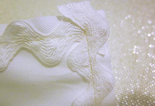NOTE: We used a slightly different color thread (and ivory) in the bobbin. Later, this will allow us to better see this original seam line and re-stitch along it with flange. - When the seam allowances are pressed and the rick rack edge is exposed you will see a clean wave pattern (sneak peek photo below).