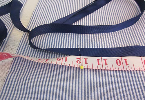 - The top edge of the top ribbon should be 7½” down from the top raw edge of the panel. The bottom edge of the bottom ribbon should be 7½” up from the bottom raw edge of the panel. This should then make the two ribbons 6″ apart in the middle, from inside edge to inside edge. One raw edge of each ribbon should be flush with the outside edge of its panel, which will leave excess ribbon in the center to tie the bows. Place a few pins to hold the ribbons in place.