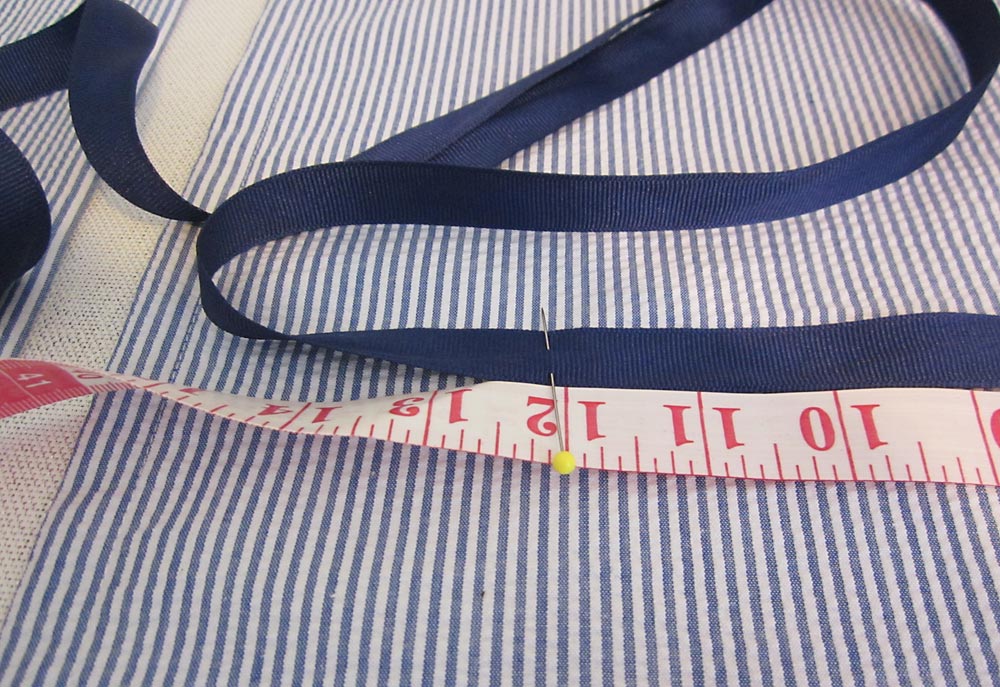 - Edgestitch the ribbon in place: sew up one side to the 12″ pin, pivot, sew across the ribbon, pivot again, sew down the opposite side. Repeat for each ribbon.