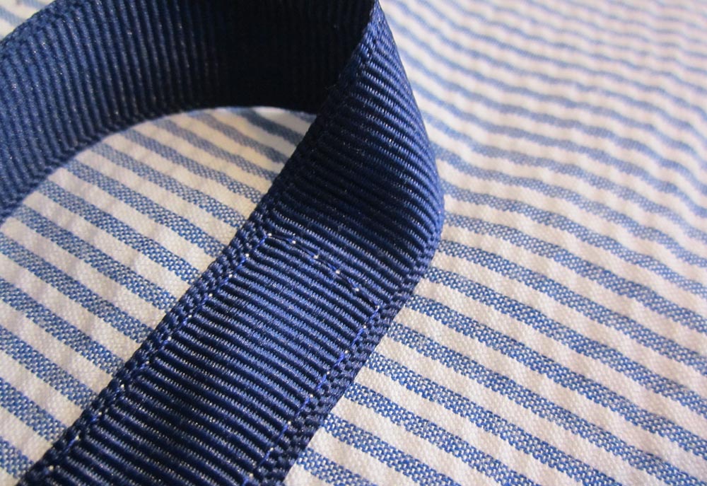 - Thread your machine with thread to match the ribbon in the top and thread to match the seersucker in the bobbin.