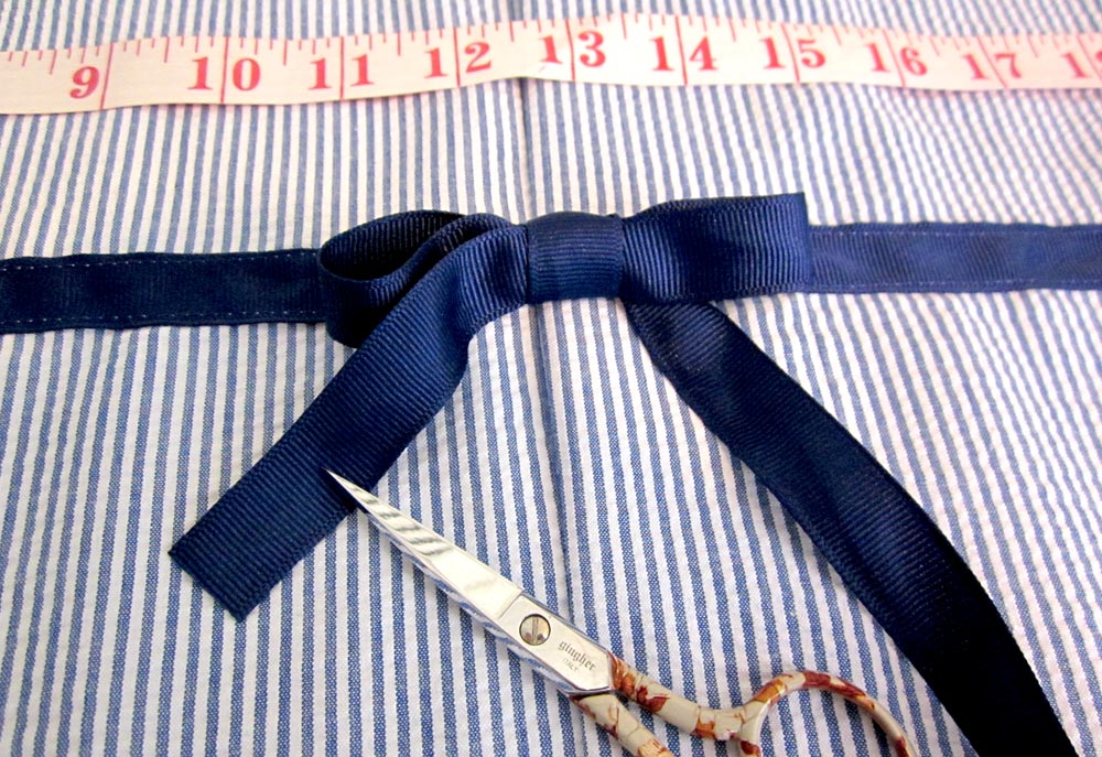 - For now, it would also be handy to simply gather up the ribbon tails and pin them towards the middle of the back panel to keep them out of the way of the final seam. You could also tie them in a temporary bow to keep them out of the way.