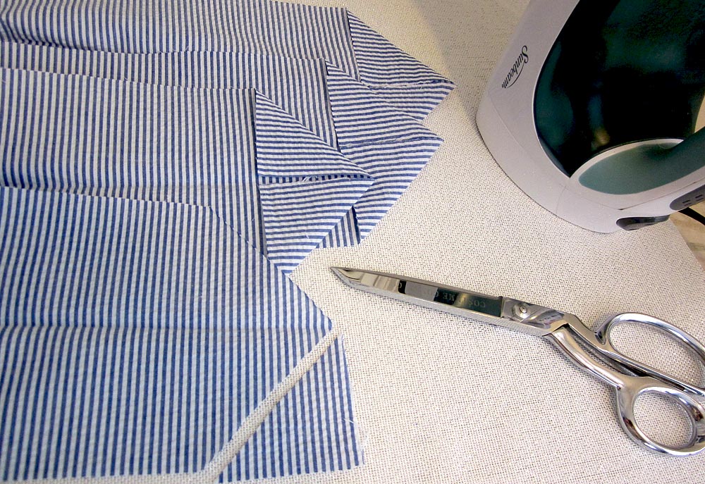 NOTE: Remember our caution from above about pressing: press down, but do not rub the iron back and forth too much. You just want to press a light crease, you don’t want to iron out the puckers. - Open the pressed points. Trim away the corners along the pressed fold lines, leaving a clean point.