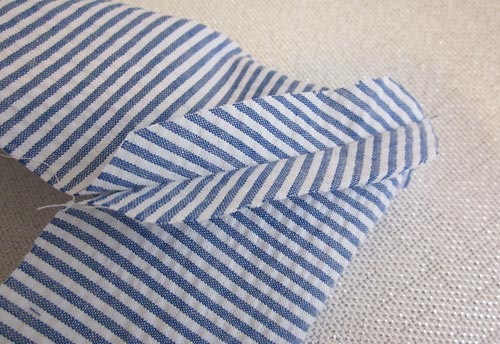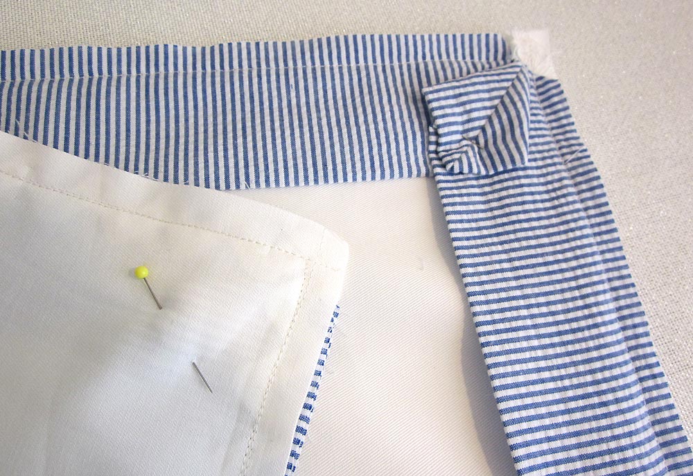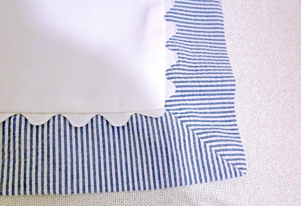 Keep It Crisp — that’s our seersucker slogan! It’s day three of the Everything Old is New Again series, sponsored by Fabric.com, and we continue our rippling romance with seersucker. Today we pair its crisp, fresh stripes with solid cotton twill to create a pair of pillow shams. Ours feature a pretty mitered flange and rick rack to frame the snow white center. If you’ve never tried mitered corners as a outer frame, we think you’ll be pleasantly surprised by how easy we’ve made it to understand.