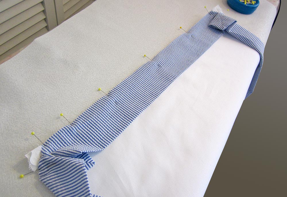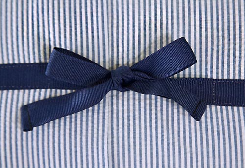 - Repeat all these steps for the remaining seersucker rectangles to add the ribbons to the back panels of second pillow sham.