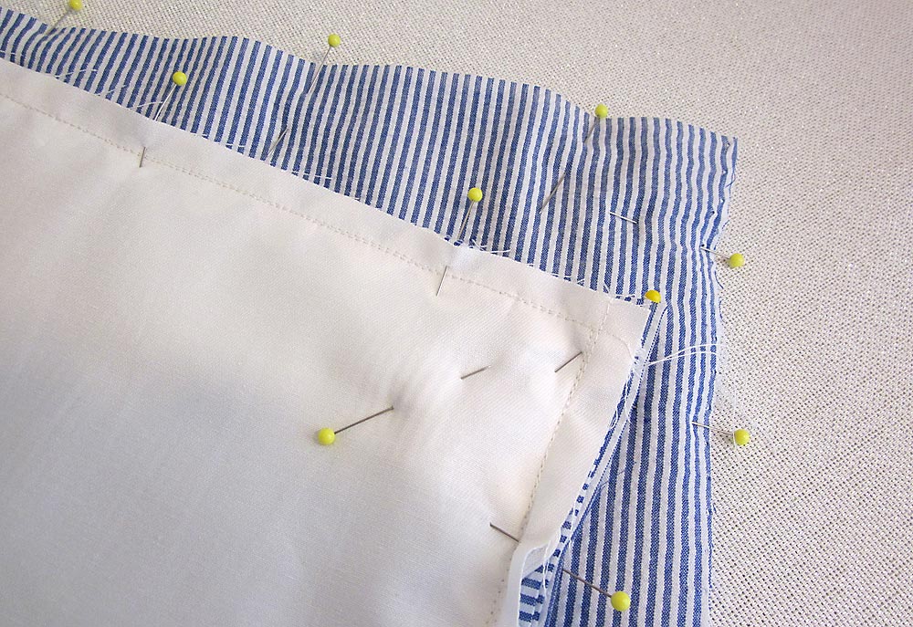 - At the top and bottom, where the two pieces overlap, hand or machine baste the pieces together within the seam allowance. This will help hold the two panels together when you sew the pillow front to the pillow back.