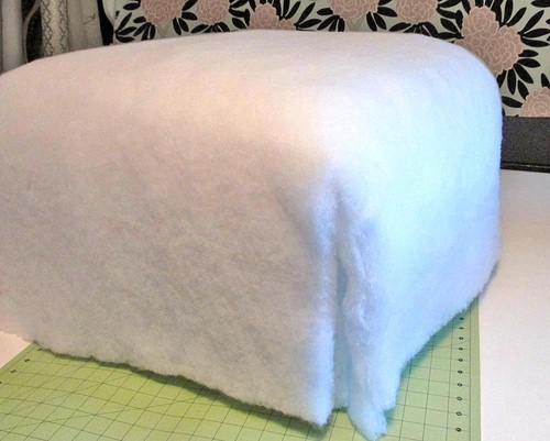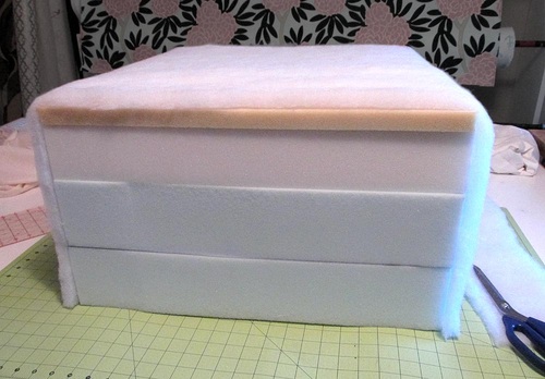 - Cut a 21″ x 45″ piece of batting. Wrap it up the side, across the top, and down the opposite side of the foam cube. There is no batting on the bottom of the cube.