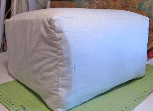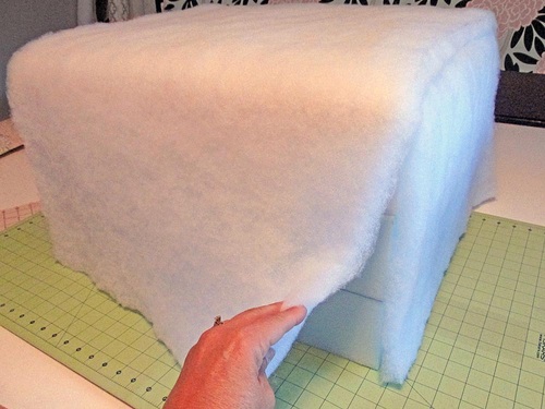 - Lay this final square batting blanket over the entire top of the cube, wrapping it down the sides, like a piece of fondant over a cake. Pinch and fold in the batting at each corner. Trim away the excess batting to create a smooth corner.