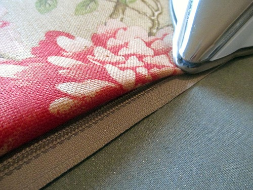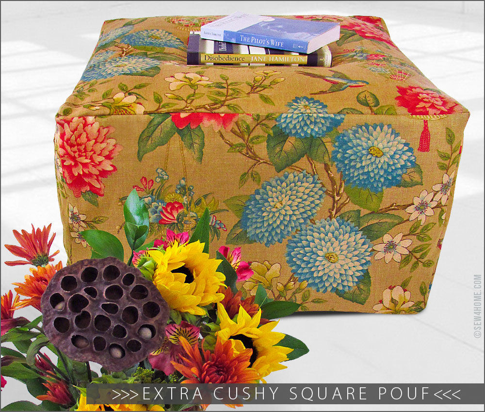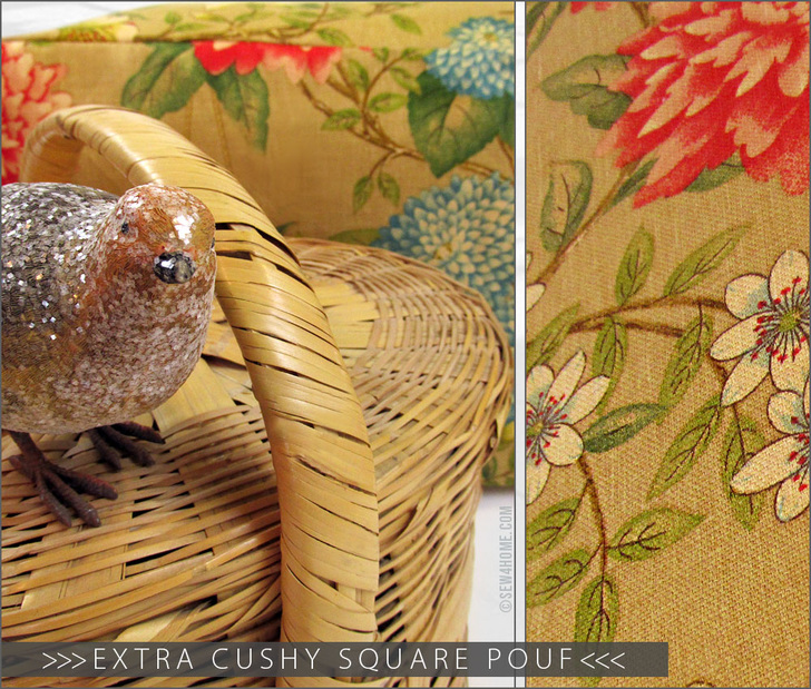 We originally used a 100% linen home décor fabric called Lightfoot Garden in Cinnabar from the Waverly Williamsburg collection. Any home décor weight fabric would work, although we do recommend looking for a softer texture with a bold motif. Super crisp upholstery options won’t give you the same wonderfully “cushy” look.