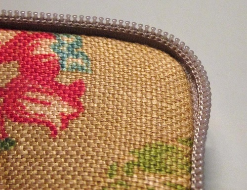 - Curve the zipper around the corner. Do not clip into the corner, just curve around with the zipper. You will need to stitch slowly, easing the fabric at the corner. This is definitely a bit of a tricky part, but for the zipper to curve properly to match the lap of the first half, it is important to create an unbroken curve. Remember, do-overs are okay. Always stop with the needle in the down position so your layers are held in place, and re-adjust as needed.