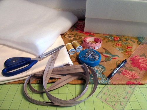NOTE: Batting is available both off the bolt and pre-packaged in a great variety of densities and widths. The yardage shown above is the minimum width required to wrap the foam as described in the instructions below. As mentioned, you want a super lofty polyester batting. - All purpose thread to match fabric