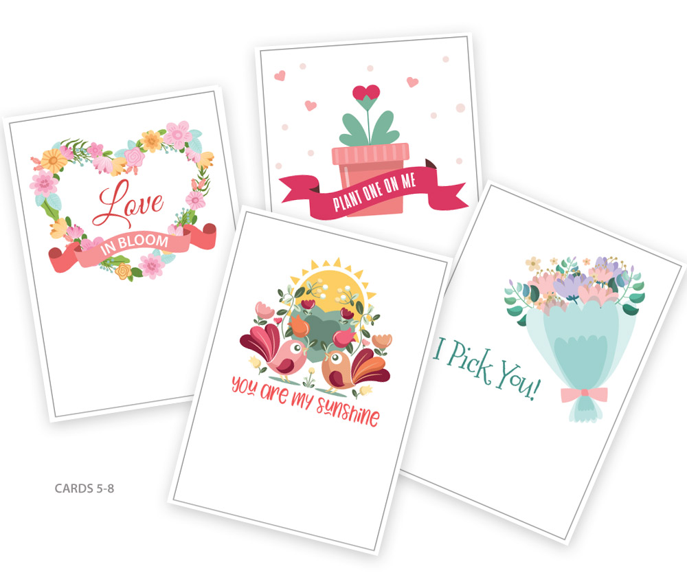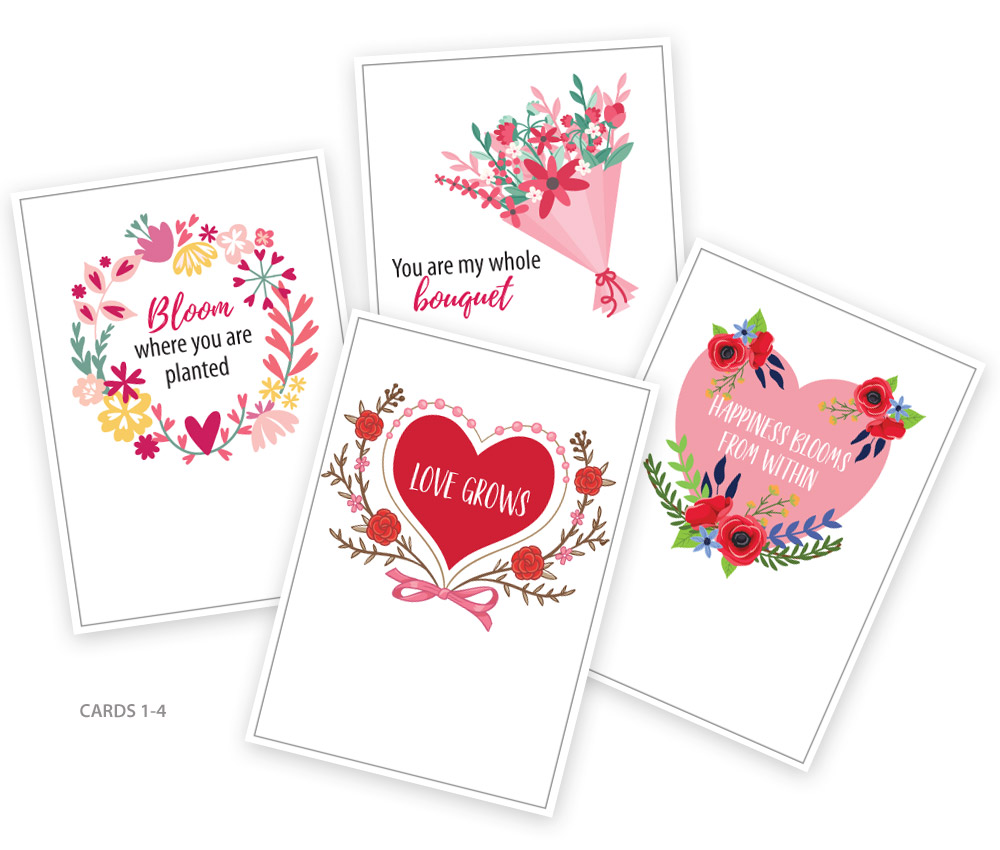 In addition to the pattern, you can also download our two sheets of pretty gift cards free of charge. They are sized to easily slip into the envelope’s pocket. We chose to include a packet of perennial flower seeds in our sample envelopes, which is certainly a gift that keeps on giving – and growing, so our cards include themes of blooming hearts and floral happiness.