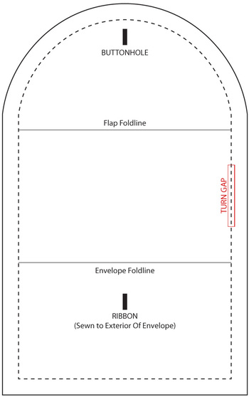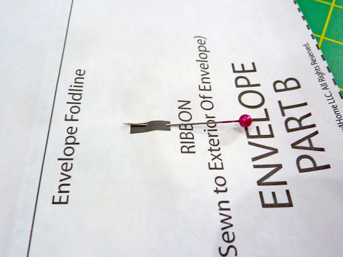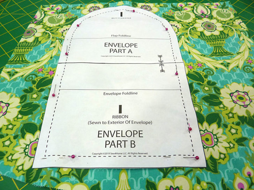 - Find the paper pattern again and use it to determine both the upper flap fold line and the lower envelope fold line. Fold the flap down along the upper flap fold line and press to set a visible crease. Unfold so the crease line is visible. Fold the bottom of the panel up along the envelope fold line and pin in place. The top straight edge of the “pocket” should sit ½” below the visible crease line of the upper flap. Pin along each side of the pocket to secure.